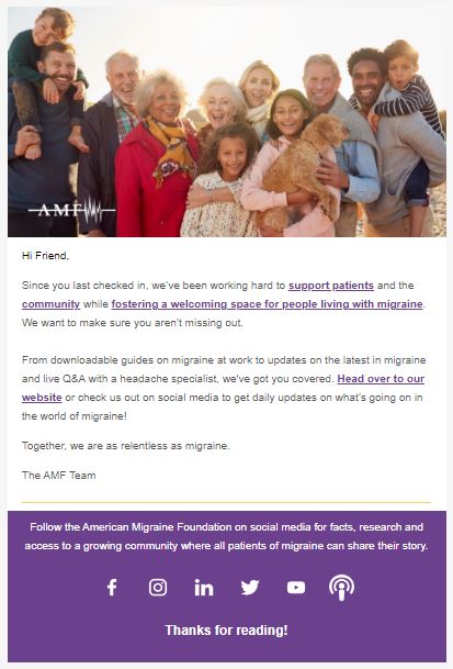Develop an email campaign aimed at re-engaging American Migraine Foundation contacts who hadn’t opened at email in at least 12 months.