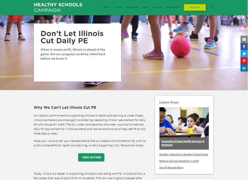The state of Illinois was considering a bill to weaken the physical education requirements in schools, so we developed an advocacy campaign to get Illinois residents to write letters to their elected officials. I developed the content and overall strategy for this landing page.